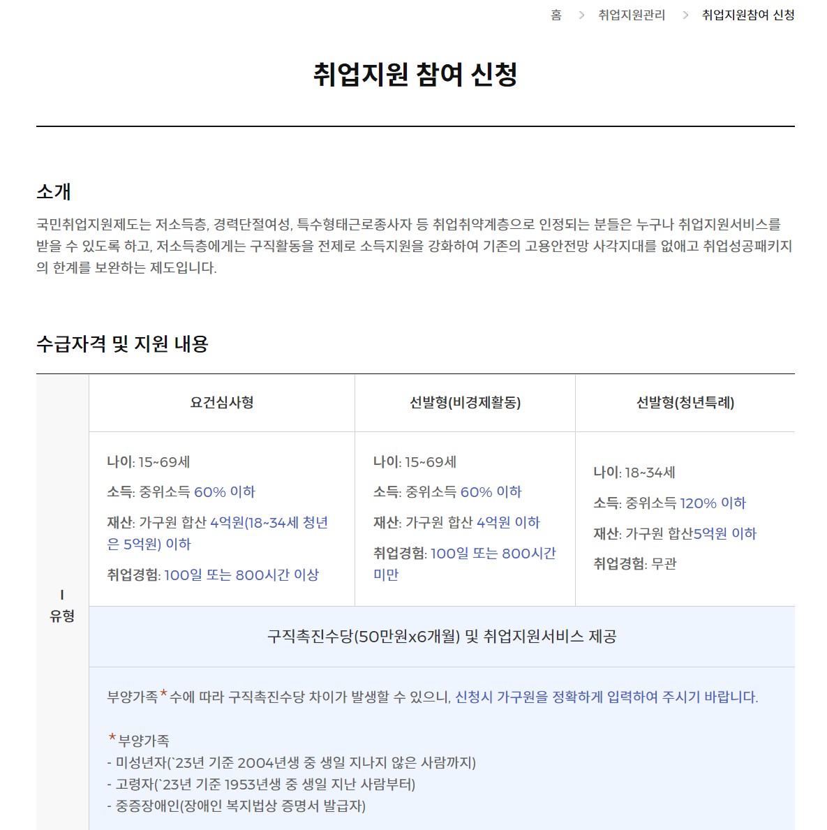 빠르게 작성을 하고 국민취업사이트에 접속하여 신청을 한다. 관련 교육영상 하나를 다 보고 워크넷 구직등록 확인도 하고 방문할 고용센터도 선택한다. 1유형의 요건심사형과 선발형을 선택하게 되어 있는데 나는 요건심사형의 기준에 부합되지 않아서 선발형으로 선택하였다. 기타 개인정보 동의 및 가구원 정보 등 필요사항을 입력하고 나면 신청 완료가 된다.