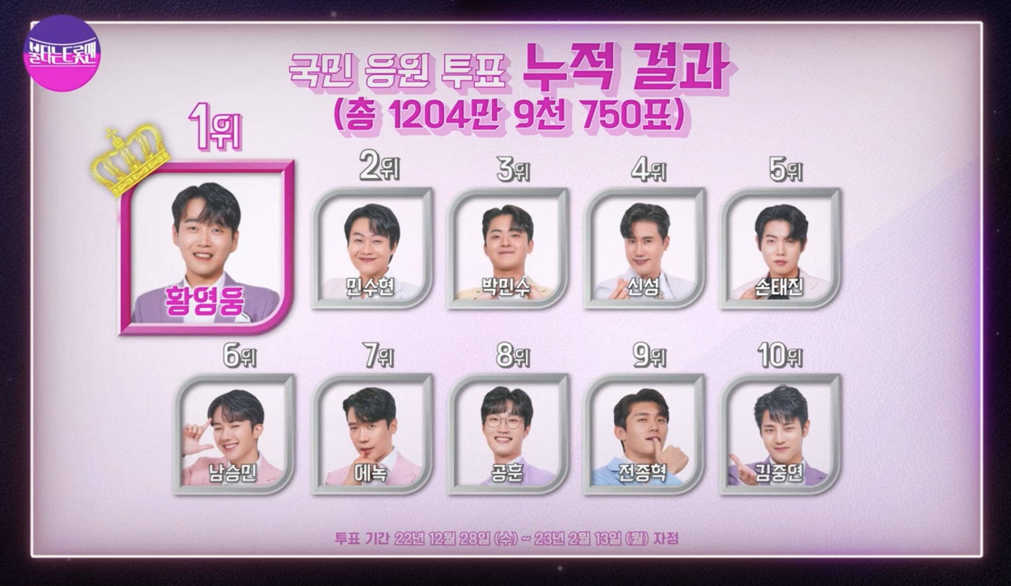 9회(2/13 월요일 자정) 국민 응원 투표 총 1204만 9천750표가 누적되었습니다.