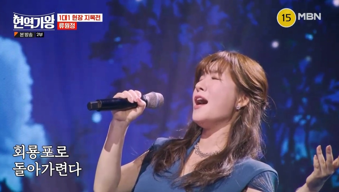 이어지는 대결로 강소리 님이 호명되었고 박성연 님을 지목하였습니다. 강소리 님은 김연자 님의 아침의 나라에서를, 박성연 님은 김완선 님의 삐에로는 우릴 보고 웃지를 열창합니다.