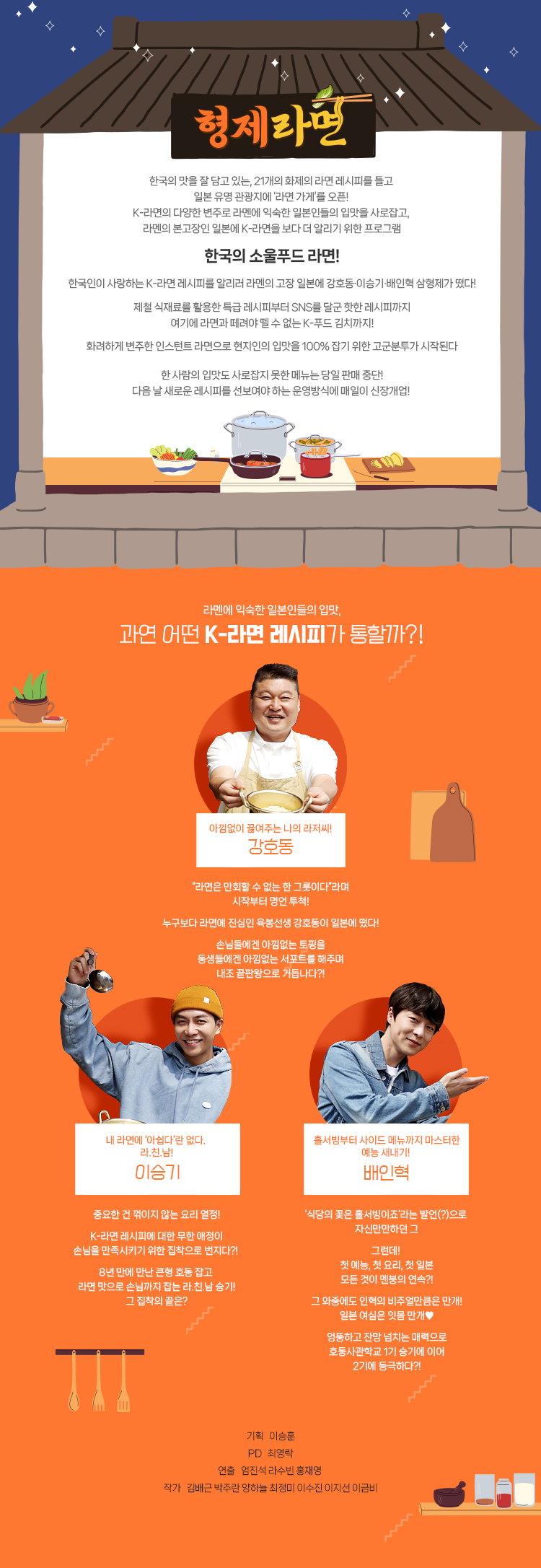 예능 5월 방영 예정 형제라면 라멘에 익숙한 일본인들의 입맛을 사로잡고 라멘의 본고장인 일본에 K-라면을 보다 더 알리기 위한 프로그램